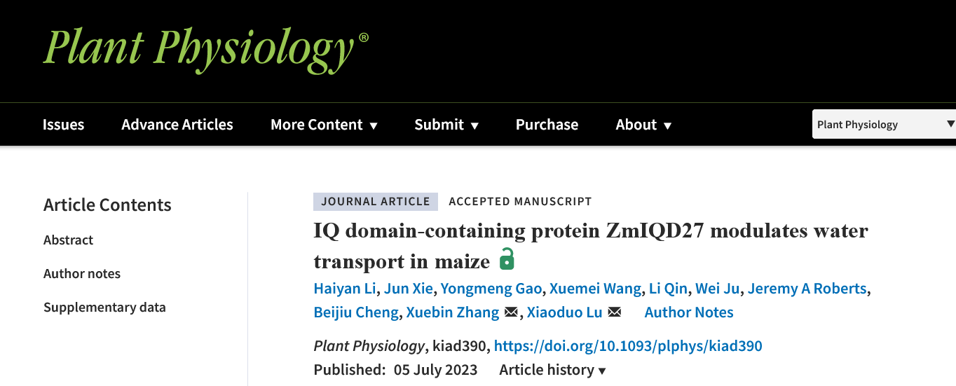 本网讯 近日,安徽农业大学生命科学学院路小铎教授课题组在《Plant Physiology》在线发表了题为“IQ-domain containing protein ZmIQD27 modulates water transport in maize”的研究论文,揭示了ZmIQD27通过与微管共定位调控玉米次生壁的沉积,影响导管发育及玉米水分运输的功能机制。