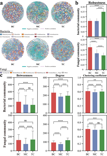 该研究解析了土壤微生物沿火山海拔梯度的群落结构和功能变化。结果表明,微生物的α多样性在火山口的中间达到峰值,细菌和真菌群落分别在火山口的底部和顶部最为稳定。此外,土壤微生物网络在不同的海拔高度上呈现出先下降后上升的趋势。最复杂和稳定的微生物网络被发现在火山口底部,与真菌网络相比,细菌网络表现出更大的复杂性。然而,真菌网络的特点是核心微生物的数量较多。pH和有机碳等环境因子对这些微生物群落的影响最大。此外,发现Cd和Cu与火山土壤核心微生物的相互作用尤为显著。该研究将为挖掘维持火山环境稳态的关键微生物物种和新型抗逆微生物提供重要理论支撑。