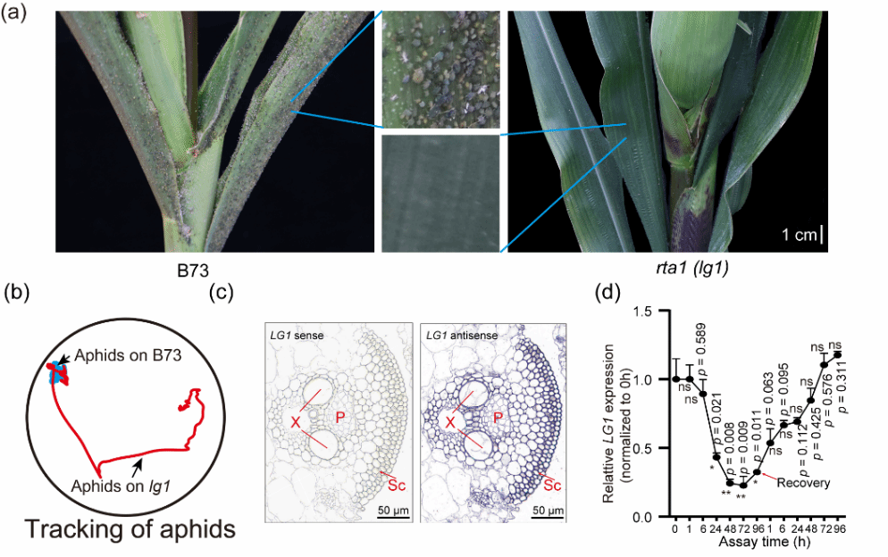 (a)B73 和 rta1 (lg1) 植株上蚜虫的积累情况。比例尺为1 cm。(b)蚜虫在B73 和 lg1上的取食运动轨迹比较。(c)玉米叶鞘横切面中 LG1 mRNA 的 RNA 原位杂交结果。正义RNA探针用作阴性对照(左图)。Sc,叶鞘细胞;P,韧皮部;X,木质部。比例尺为50 μm。(d)LG1 基因表达受蚜虫侵害影响。