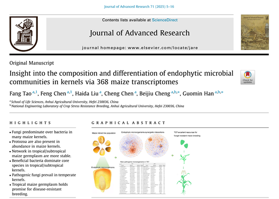 本网讯 近日,学院作物抗逆育种与减灾国家地方联合工程实验室韩国民教授和程备久教授团队联合在国际知名学术期刊《Journal of Advanced Research》(中国科学院1区Top期刊,IF:11.4)正式在线发表了题为“Insight into the composition and differentiation of endophytic microbial communities in kernels via 368 maize transcriptomes”的研究论文。