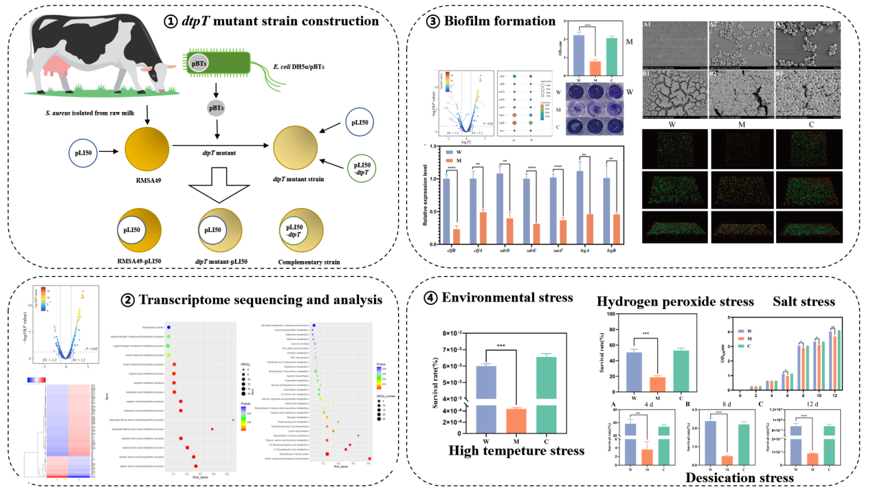 金黄色葡萄球菌(Staphylococcus aureus,S. aureus)为常见革兰氏阳性条件致病菌,是引起社区感染及院内感染的主要病原,此外,食源性金黄色葡萄球菌也是重要的危害食品安全的主要风险源,尤其是食源性耐甲氧西林金黄色葡萄球菌(Methicillin-resistant Staphylococcus aureus,MRSA),因其耐药性强、生物被膜形成能力强、抗逆境能力强等特性,是危害食品安全及人体健康的重要风险。乳制品加工过程中,经过高温、干燥等胁迫条件下,部分耐甲氧西林金黄色葡萄球菌如何通过部分基因表达模式的变化,进而抵抗逆境条件实现存活导致在食品中残留,学术界报道较少,近年来课题组针对食源性耐甲氧西林金黄色葡萄球菌的抗逆性调控机制开展了一系列研究工作。