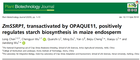 本网讯 近日,我校作物抗逆育种与减灾国家地方联合工程实验室武健东、李晓玉团队在国际知名植物学期刊《Plant Biotechnology Journal》在线发表了题为“ZmSSRP1, transactivated by OPAQUE11, positively regulates starch biosynthesis in maize endosperm”的研究论文,揭示了OPAQUE11-ZmSSRP1模块调控玉米籽粒淀粉合成的分子机制,完善了玉米籽粒淀粉合成的遗传调控网络,为玉米产量和品质遗传改良提供重要依据。