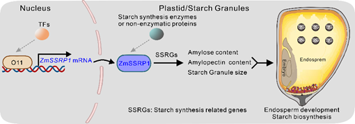 该研究鉴定到了一个定位于质体、玉米胚乳高表达、具有碳绑定结构域CBM48(carbohydrate-binding module 48)的非酶蛋白质ZmSSRP1。通过分析ZmSSRP1的Crispr/Cas9突变体和过表达材料发现,其突变体表现出直链淀粉和支链淀粉的合成显著降低,淀粉颗粒和胚乳减小;相反,过表达ZmSSRP1会导致直链淀粉和支链淀粉的积累增加,淀粉颗粒和胚乳变大。通过转录组数据分析发现ZmSSRP1的缺失会导致直连淀粉和支链淀粉合成酶相关基因的表达显著下调。进一步分析发现,玉米胚乳发育和营养代谢核心转录因子OPAQUE11(O11)能与ZmSSRP1启动子结合,激活 ZmSSRP1的表达; O11突变体和过表达玉米籽粒淀粉性状数据结果显示O11正向调控玉米淀粉合成和胚乳发育;遗传关系证据表明O11作用于ZmSSRP1的上游。此外,该研究还发现,与其水稻中同源蛋白FLO6不同,ZmSSRP1并不与淀粉合成关键酶如可溶性淀粉合成酶(ZmSS4)和淀粉脱分支酶(ZmISA1)相互作用,暗示ZmSSRP1在玉米中的功能分化,形成不同的籽粒胚乳淀粉合成分子机制。