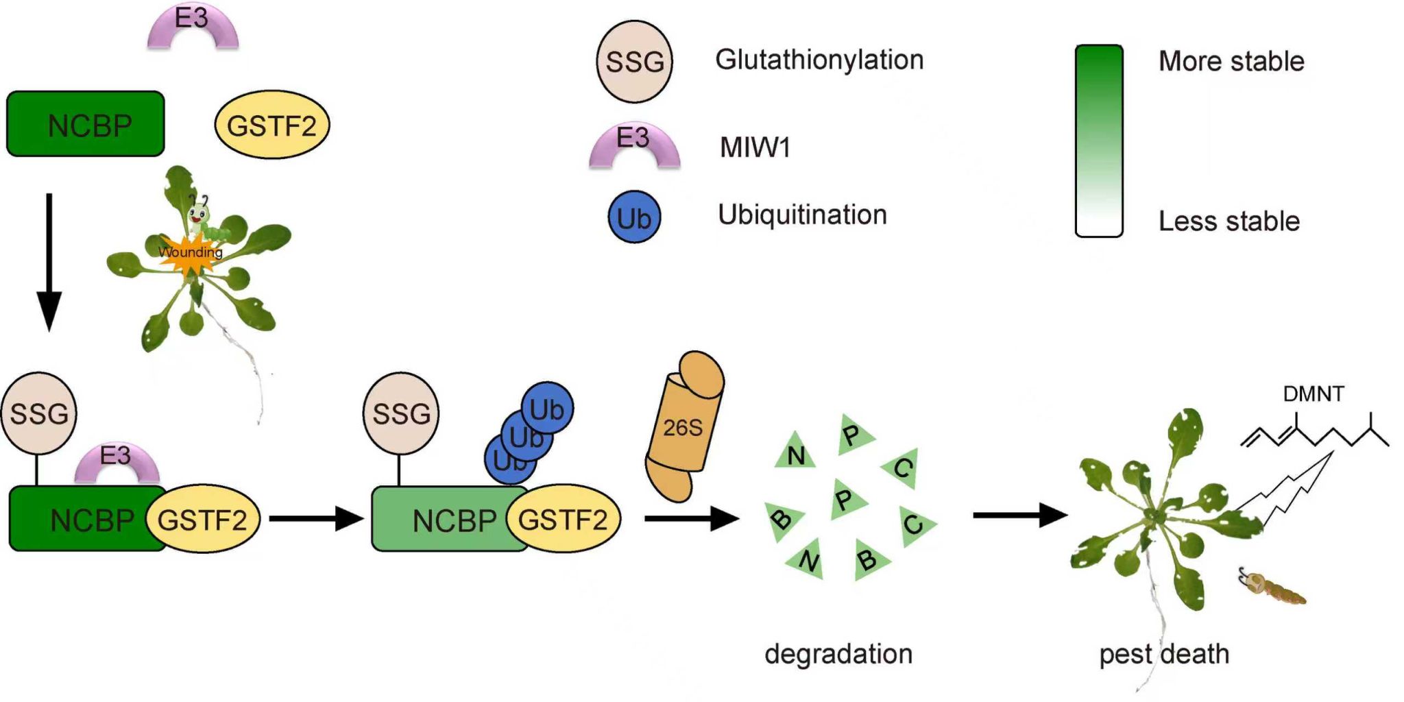 GSTF2能响应虫害刺激,介导NCBP的谷胱甘肽化修饰,并通过增强NCBP与MIW1相互作用,触发NCBP的降解过程(图1),为进一步揭示植物蛋白谷胱甘肽修饰和泛素化降解机制提供了重要线索。