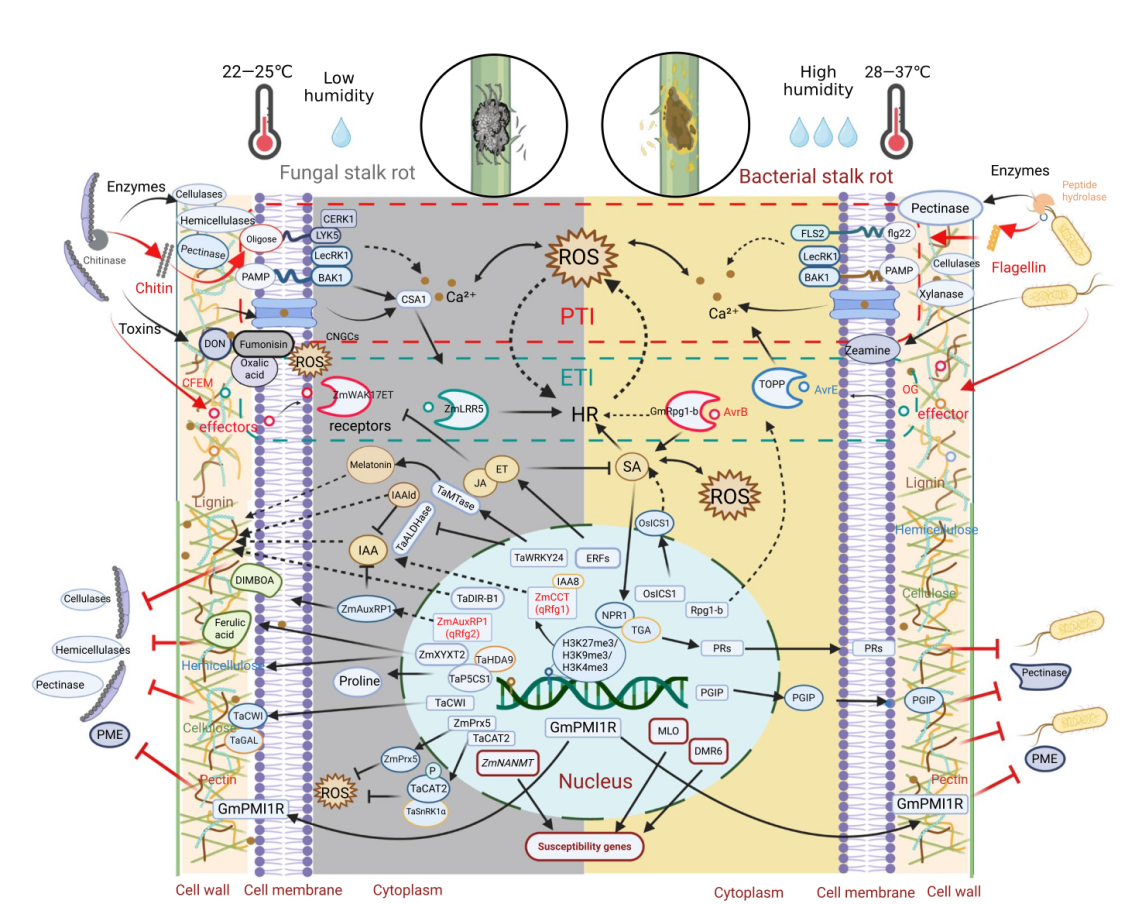图. 真菌性和细菌性茎腐病病原菌入侵机制比较分析和植物抗病分子调控网络的解析。