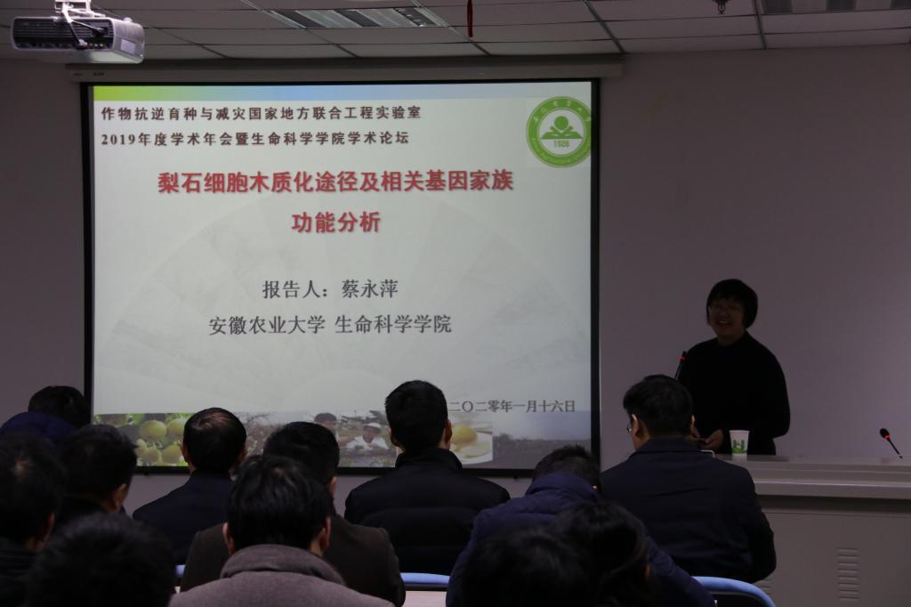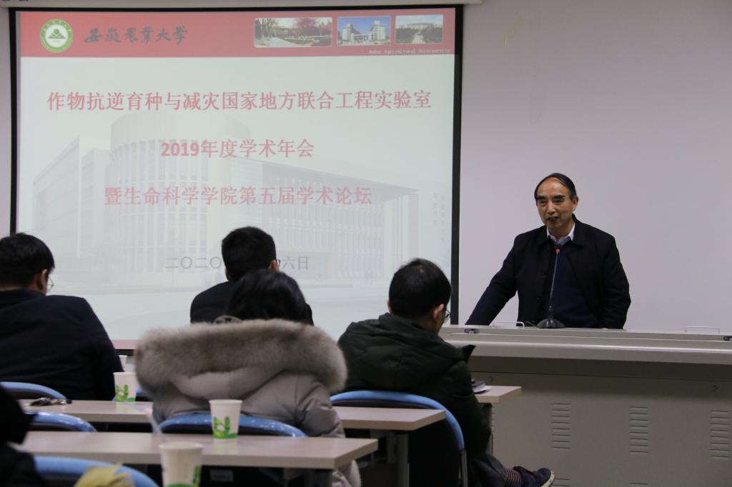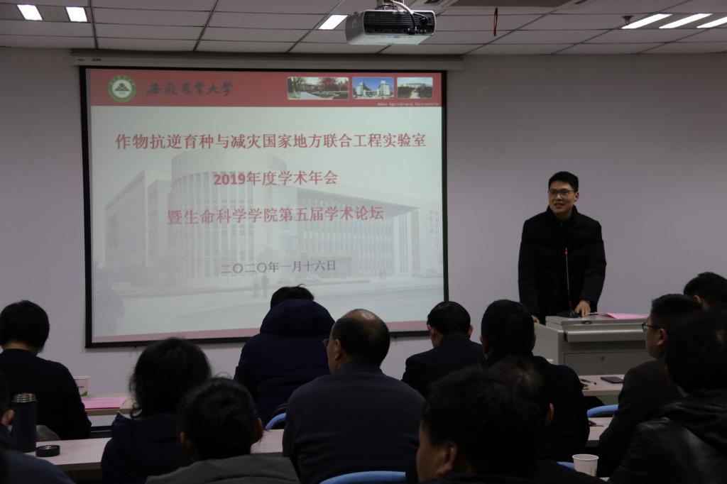 本网讯: 1月16日,我校作物抗逆育种与减灾国家地方联合工程实验室2019年度学术年会暨生命科学学院第五届学术论坛在生物科技楼成功召开。实验室主任程备久、学院党委书记张健、常务副院长蔡永萍、学院党委副书记吴国卿、副院长江海洋出席了学术年会,学术年会由蔡永萍主持。国家地方联合工程实验室、全院教职工及研究生共计100余人参加。张健书记致辞表示学术年会的成功召开是全院的一件大事,相互交流才能共同提高,共同促进生物学学科向高水平发展。总共18位老师分别代表团队进行了总结汇报,并进行了充分的讨论与交流。