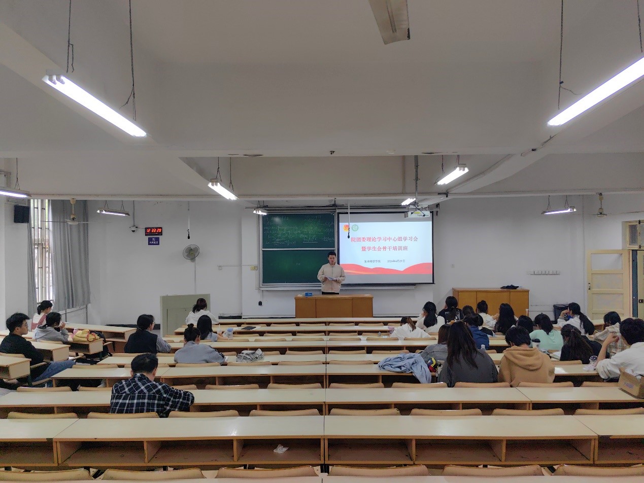 本网讯 4月29日中午,生命科学学院在勤学楼103教室召开院团委理论学习中心组会议暨学生会骨干培训班,学院团委理论学习中心组全体成员、本硕各班级团支部书记、院学生会各部门负责人参加会议,会议由院团学工作负责老师主持。