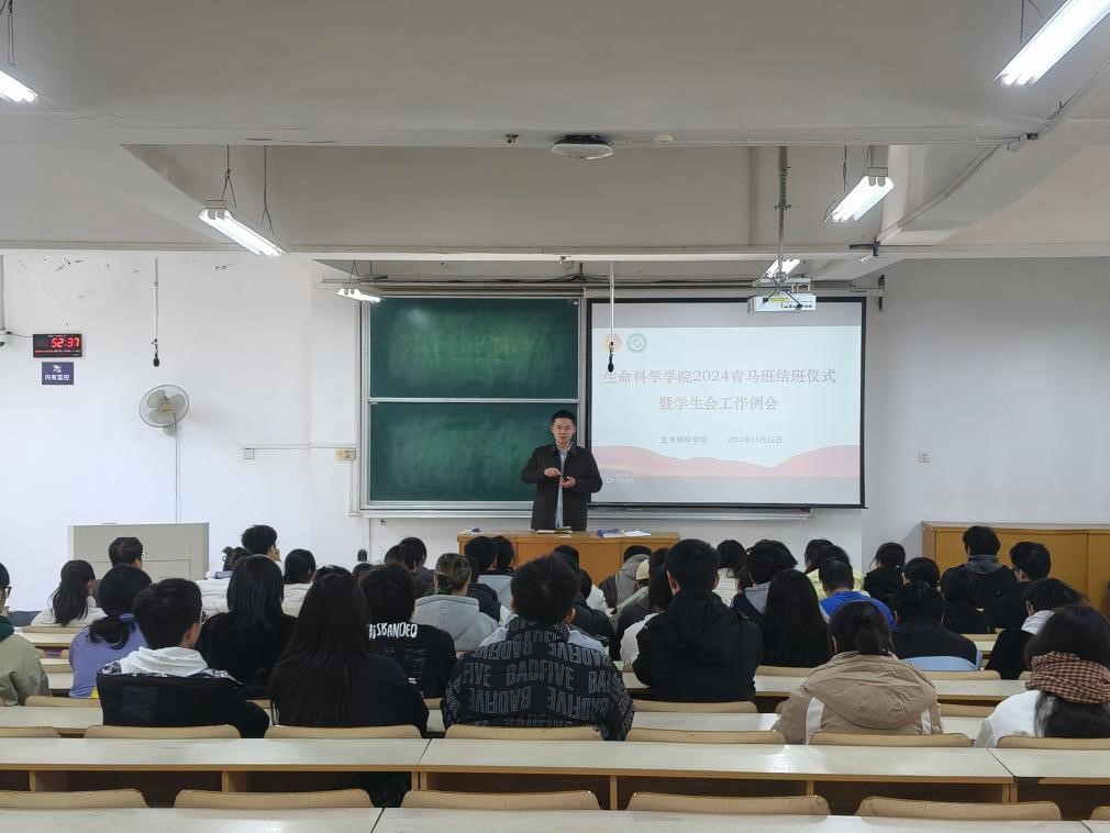 本网讯 为深入学习贯彻党的二十届三中全会精神,认真贯彻习近平总书记关于青年工作的重要思想,11月26日中午,生命科学学院在勤学楼103教室召开2024年青马班、团干部培训班结班仪式暨学生会工作例会,青马班全体学员、学生会全体成员参加会议,会议由院团学负责老师主持。
