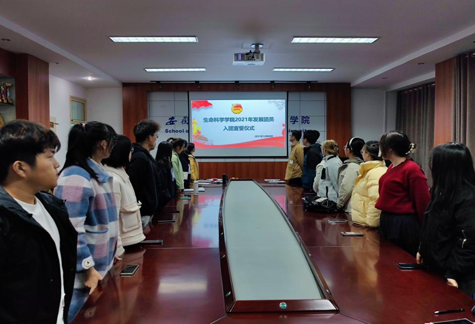 本网讯 “我志愿加入中国共产主义青年团,坚决拥护中国共产党领导,···”12月8日晚,生命科学学院418会议室传来深情激昂、振奋人心的入团宣誓誓词,生命科学学院2021年发展团员入团仪式在这里庄严召开。学院团委副书记、新发展团员及其团支部书记和院学生会团学工作部成员参加了本次会议,2021级团支部书记现场观摩学习。