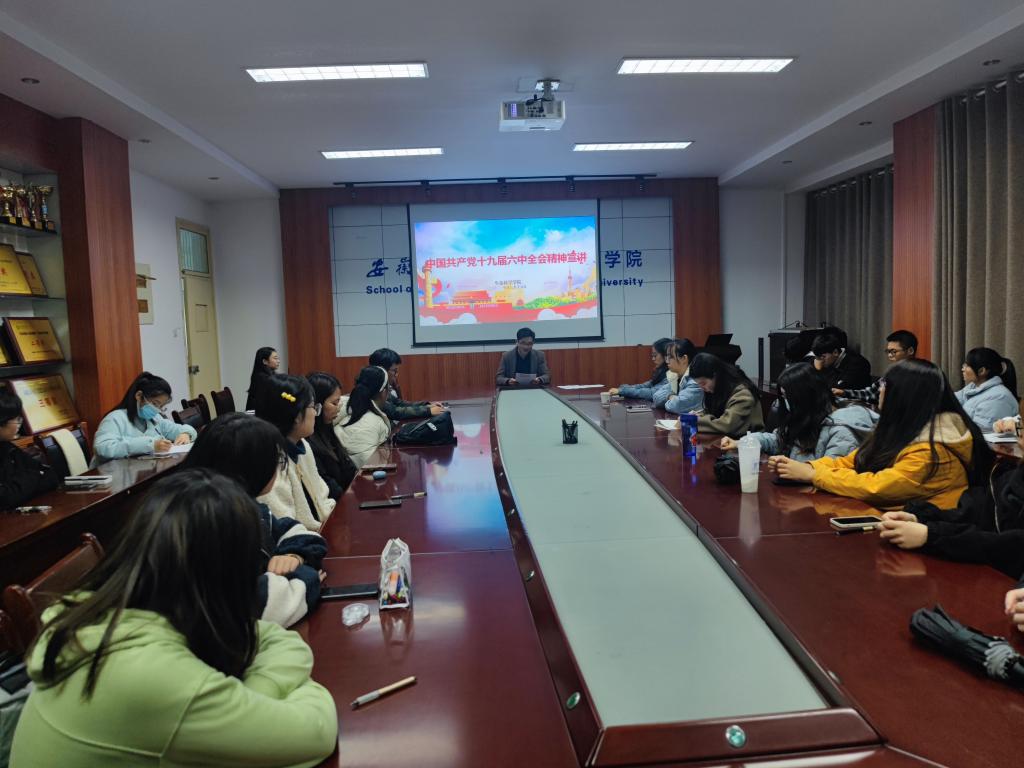 韩天才领学了《中共中央关于党的百年奋斗重大成就和历史经验的决议》、习近平总书记《关于〈中共中央关于党的百年奋斗重大成就和历史经验的决议〉的说明》和《中国共产党第十九届中央委员会第六次全体会议公报》等内容。他指出,全院团支部、青年学子要及时学习,铭记历史,让建党精神代代相传,并深入思考如何结合团支部工作将《决议》精神贯彻落实。他强调,全院团员干部要把思想和行动统一到全会精神上来,把学习贯彻全会精神与深入贯彻习近平新时代中国特色社会主义思想结合起来;与贯彻落实习近平总书记“七一”重要讲话精神和习近平总书记视察安徽重要讲话精神结合起来;与当前开展的党史学习教育紧密结合起来。进一步坚定信心,振奋精神,全面推进学院团学工作高质量开展。