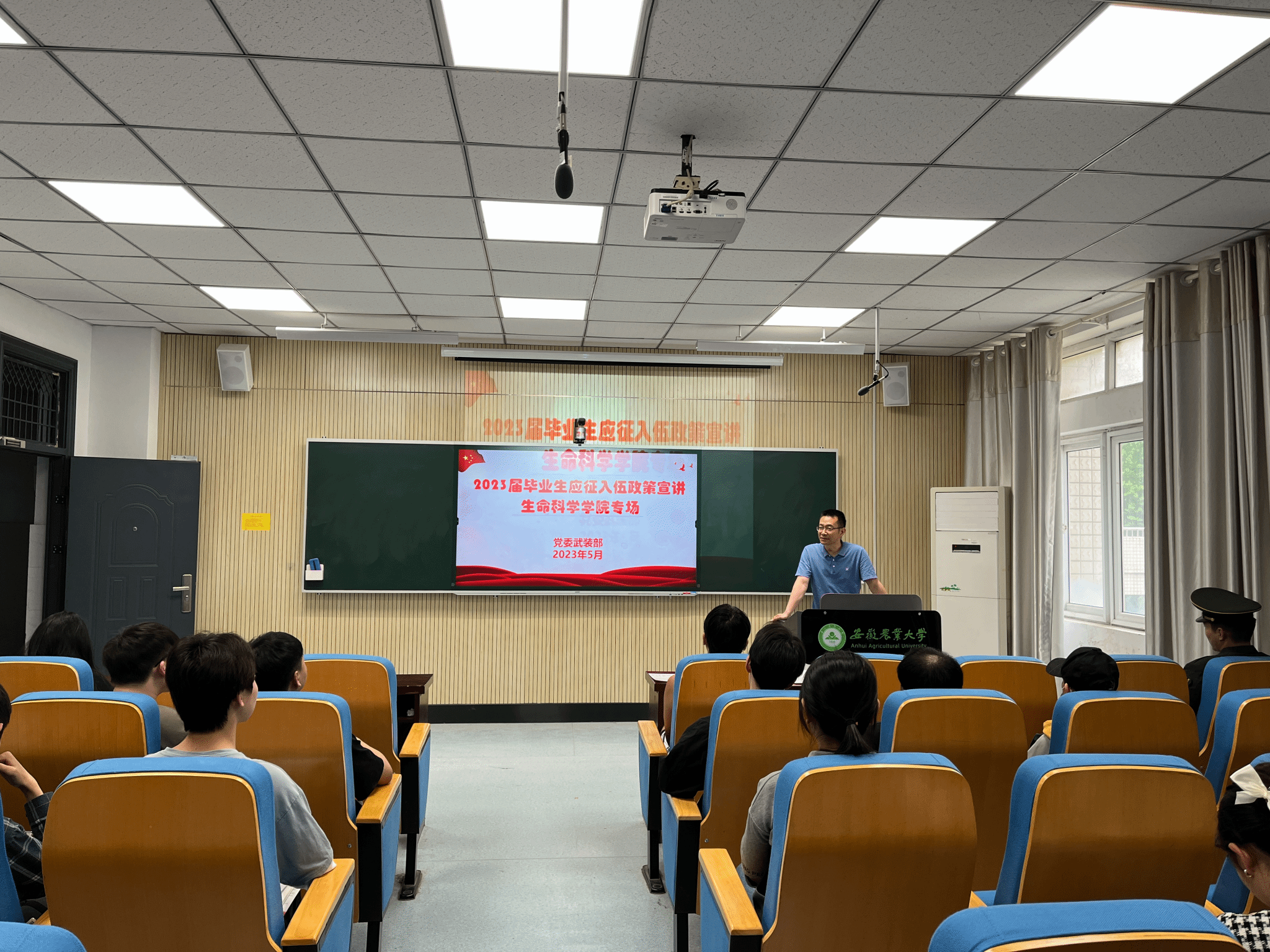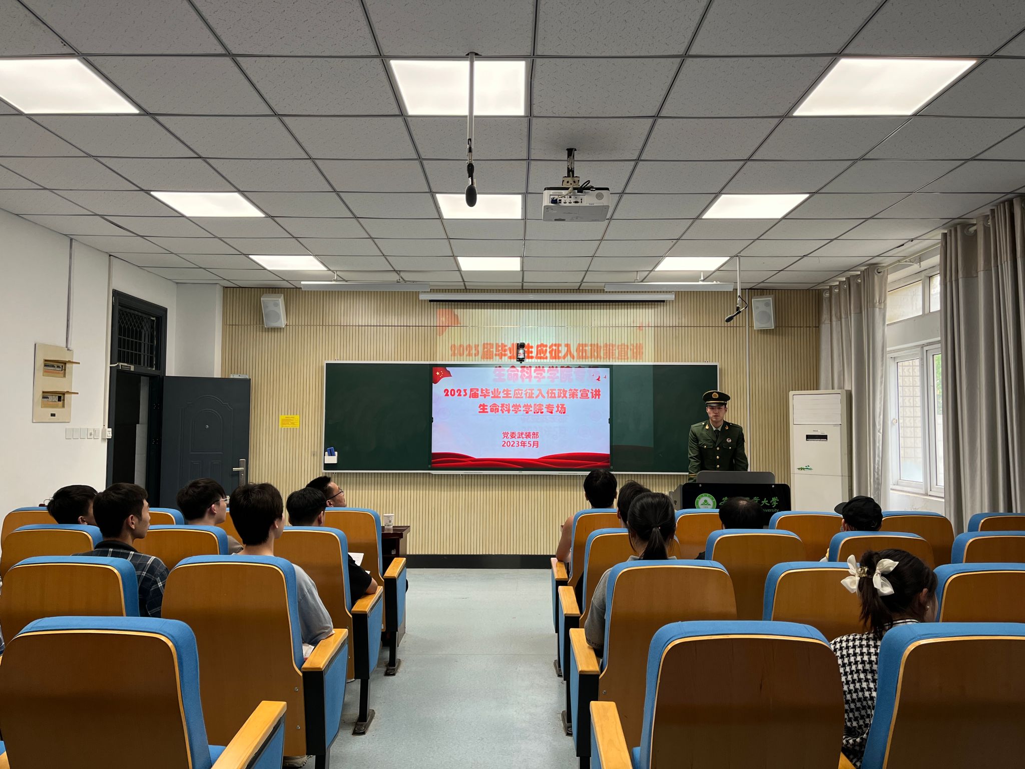 本网讯 为深入贯彻落实习近平强军思想,进一步提高征兵政策宣讲覆盖面,推进我国国防和军队现代化建设,激励热血青年学子应征入伍,报效祖国,5月10日下午,生命科学学院举行2023年征兵工作宣讲会。校党委学工部(处)、武装部国防教育科科长程玉磊,生命科学学院征兵工作负责人汪健、生命科学学院优秀退役士兵代表朱国海同学以及毕业班部分未考研学生参加会议。