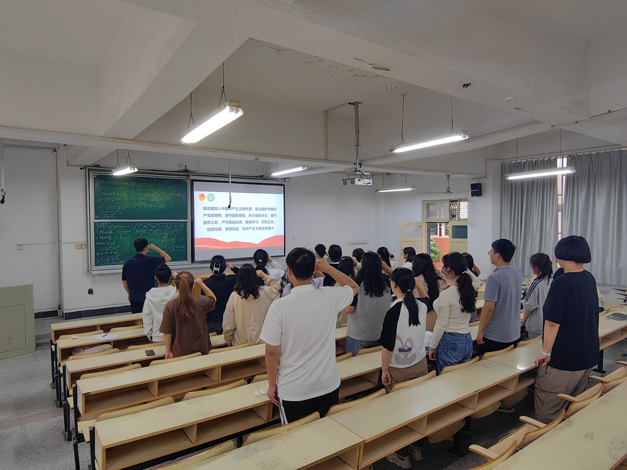 入团仪式在高昂的国歌声中拉开序幕。院团委负责老师宣读了本次发展团员名单,并向全体新发展团员表示热烈祝贺。各班团支书为本班级新发展团员佩戴团徽。院团委负责老师强调,希望新发展团员同学坚定继承和发扬共青团的优良传统,以高标准、严要求不断鞭策自己,为学院和学校的高质量发展贡献自己的一份力量。仪式最后,院团委负责老师带领大家一起进行入团宣誓。