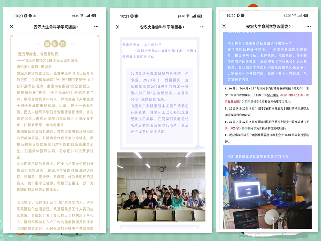 本网讯 为了让青年团员了解中国近代史的风云变迁与快速发展,认识年初对抗新冠肺炎疫情的人民战争,展示青年蓬勃向上的精神风貌,进一步提升团支部活力,9月29日-10月10日,生命科学学院团委开展了“坚定跟党走 奋进新时代”主题团日活动。