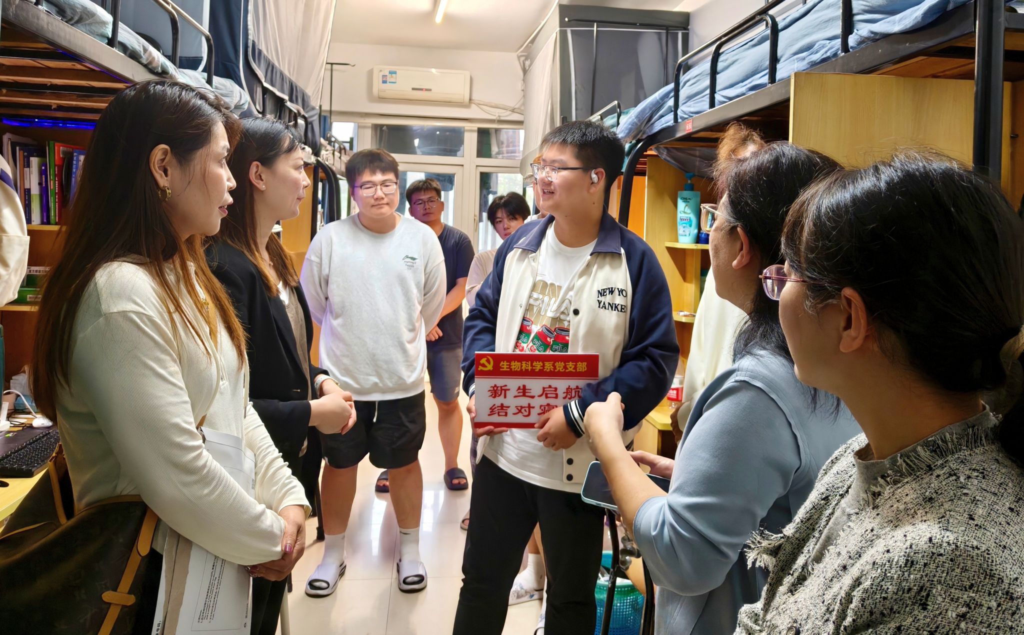 本网讯 10月15日下午,生命科学学院生物科学系党支部书记李晓玉带领支部党员教师,走进该系2025级本科新生宿舍,开展了一场别开生面的入党启蒙教育,并结对部分新生宿舍。
