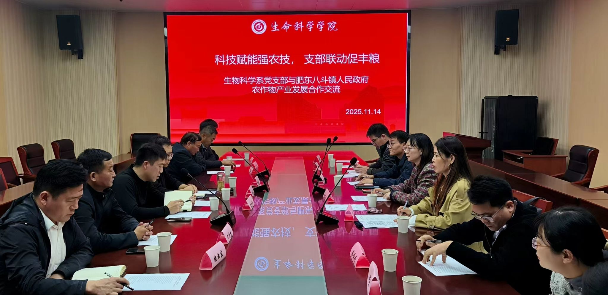 本网讯 11月14日下午,生物科学系党支部与肥东八斗镇人民政府在生物科技楼会议室开展农作物产业发展合作交流,以党建引领,创新校地合作模式,搭建科研与乡村产业深度融合的技术服务平台。