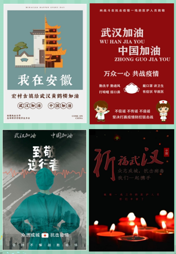 2月,学院组织国助生开展了“武汉加油!中国加油!”海报征集活动,向每一位在抗击疫情一线的医护工作者和所有坚守在一线岗位的劳动者致敬。每幅作品都经过参赛的同学们精心构思,用心创作,都是对当下疫情诉以最美好的愿景,本次活动的开展,旨在引导当代大学生众志成城,共克时艰,培养当代大学生的社会责任感和使命感。