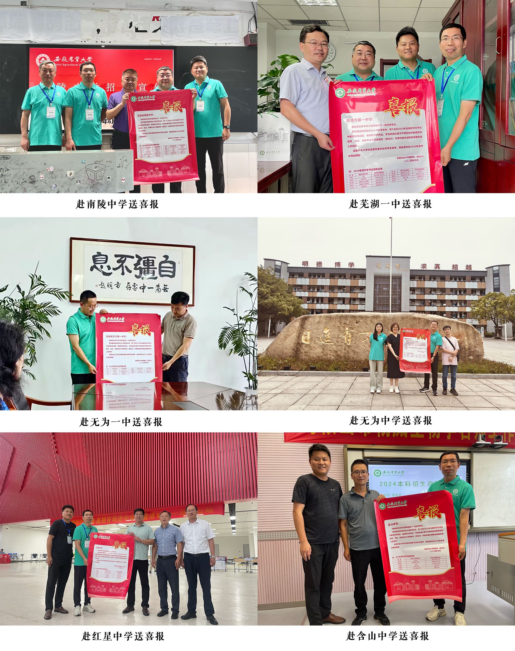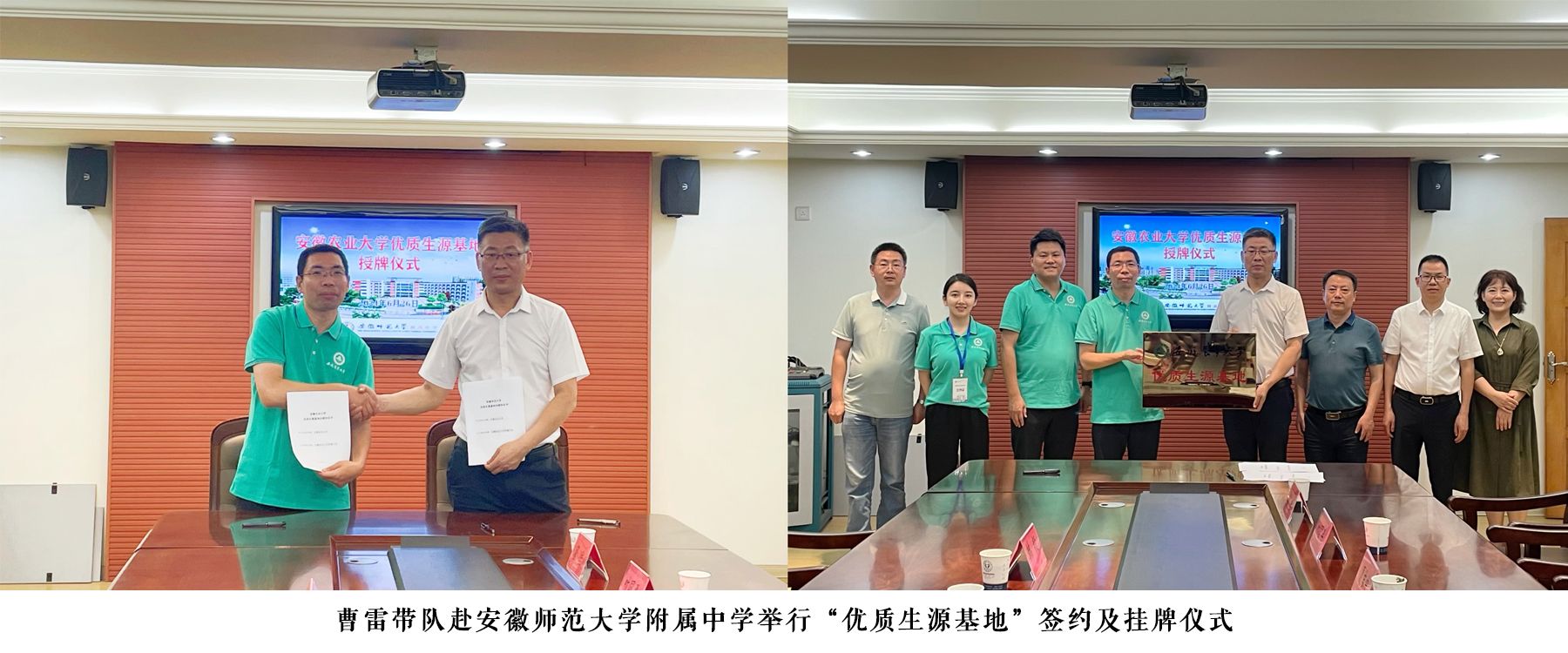 协同育人,共建共赢。6月27日,曹雷带队赴安徽师范大学附属中学举行“优质生源基地”签约挂牌仪式,安徽师范大学附属中学党委书记夏吉中,党委副书记、校长毛宣海等学校班子成员全员出席。双方现场签订了优质生源基地共建协议书,并举行“优质生源基地”授牌仪式,希望以此次签约为契机,两校开展多元化合作,积极探索人才培养新模式。招生宣传期间,学院一行分别向6所生源基地中学送上考研喜报,生源地中学主要负责人对学院一行的来访表示热烈欢迎,对学校的办学理念、综合实力和人才培养等方面给予了充分肯定。院领导代表学校向中学的辛勤培养和教育表示感谢,欢迎更多的优秀学子报考安徽农业大学,为国家建设和发展培养更多的优秀人才。