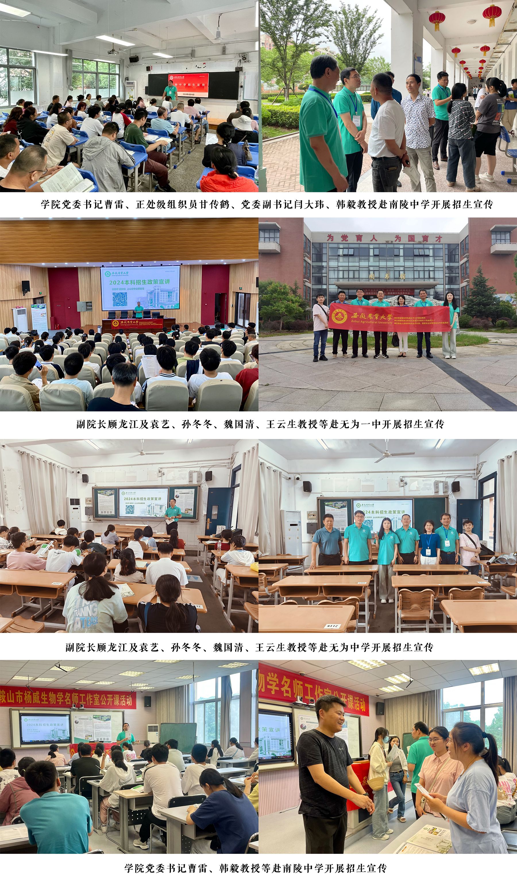 本网讯 为进一步做好学校2024年招生宣传工作,深入推进优质生源基地建设,6月25日-28日,生命科学学院党委书记曹雷、正处级组织员甘传鹤、党委副书记闫大玮、副院长顾龙江,学院专家教师袁艺、韩毅、孙冬冬、王云生、魏国清等分赴芜湖一中、安师大附中、南陵中学、含山中学、无为一中、无为中学、红星中学等学校开展系列招生宣传活动。