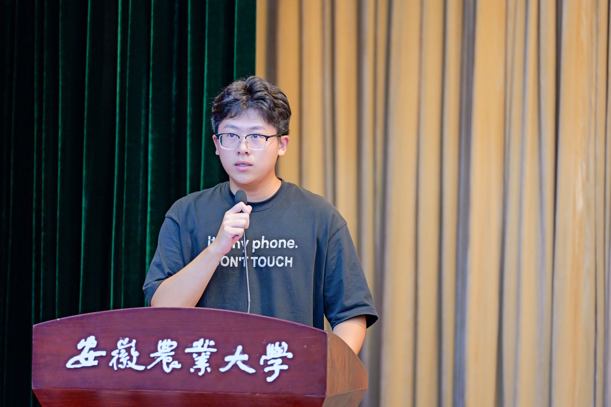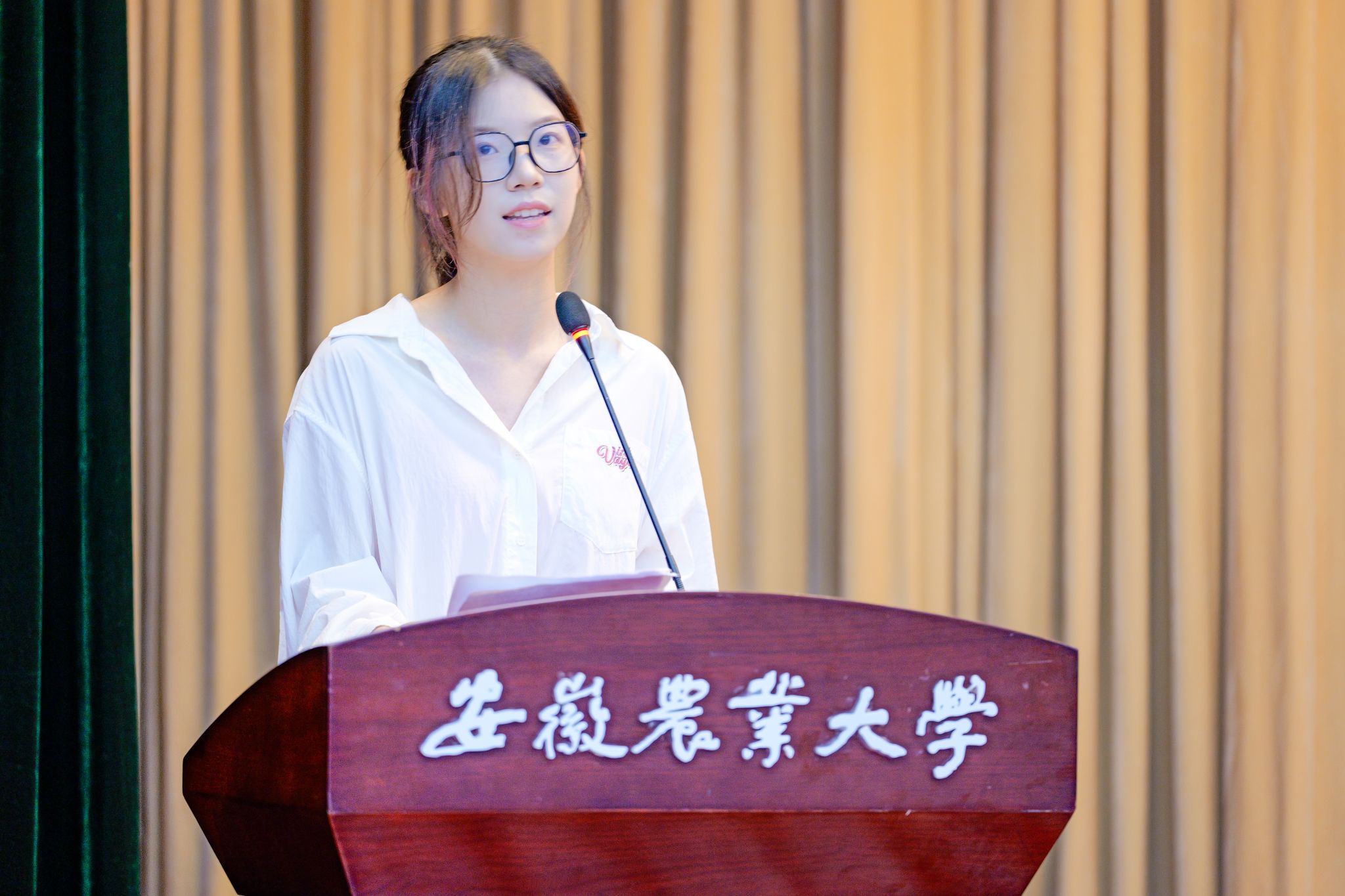 新生代表2024级生物制药专业邹石玉同学,从近期的军训和校园生活对大学生涯提出展望。他表示来到安农,进入生科院,能够获得丰富的资源使他倍感荣幸,将秉承“厚生、立命、盈科、笃学”院训,努力学习,规划未来;传承“团结、勤奋、求实、创新”校风,“脚踏实地”校训,勇敢面对挑战,在安农绽放光彩。