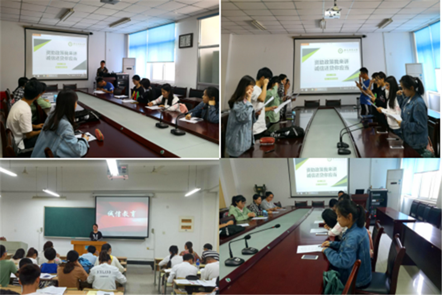 5月,学院开展资助诚信教育系列主题活动。在“资助政策我来讲 诚信还贷你应当”讲座中,团委老师对我校资助政策----奖贷助补免政策进行了详细解读,并对助学贷款的还款流程进行了讲解。在诚信签名活动暨诚信承诺书签订活动中,同学们积极响应,认真阅读并签订了诚信承诺书,立志以实际行动“践诚信”。在诚信宣誓活动中,同学们慷慨激昂,进行了神圣而庄严的宣誓。在诚信教育主题班会中,各班通过在学习、工作、生活等多个方面讲解诚信案例、诚信故事,号召同学们树立诚信观念,发扬契约精神,并在接下来的期末考试中做到诚信考试。
