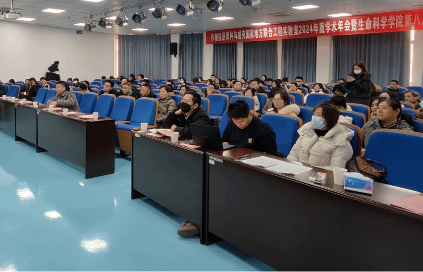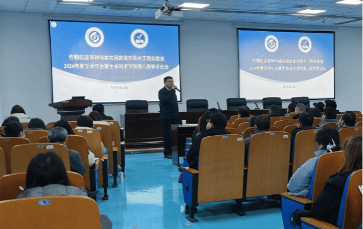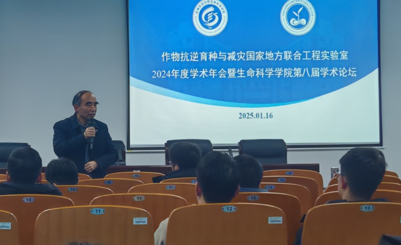 本网讯 1月16日,作物抗逆育种与减灾国家地方联合工程实验室2024年度学术年会暨生命科学学院第八届学术论坛在生物科技楼B438顺利举行。生命科学学院全体教职工及研究生共计200余人参加论坛,学院院长薛挺、实验室常务副主任李培金、副院长张应烙和顾龙江分阶段主持会议。