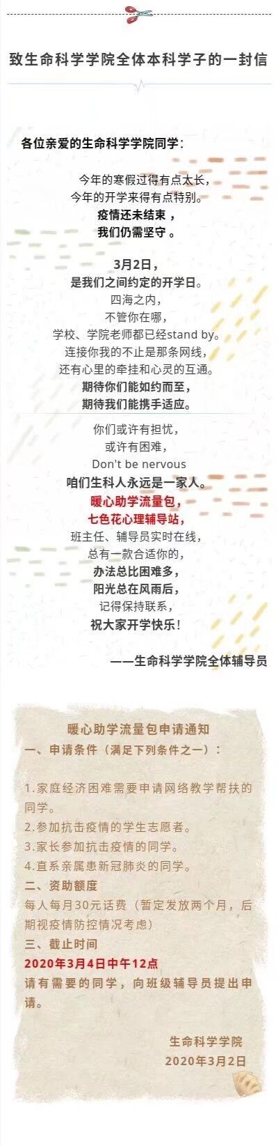 《生命科学学院辅导员致学院全体本科生的一封信》在学院官微、QQ上发布,辅导员同时将其推送给每位本科生。“疫情还未结束,我们仍需坚守”“学校、学院老师都已经stand by,连接你我的不止是那条网线,还有心里的牵挂和心灵的互通……”一句句亲切的话语传递着浓浓的温情,一声声语重心长的叮嘱表达了学院对学生平安归来的期盼与叮咛。