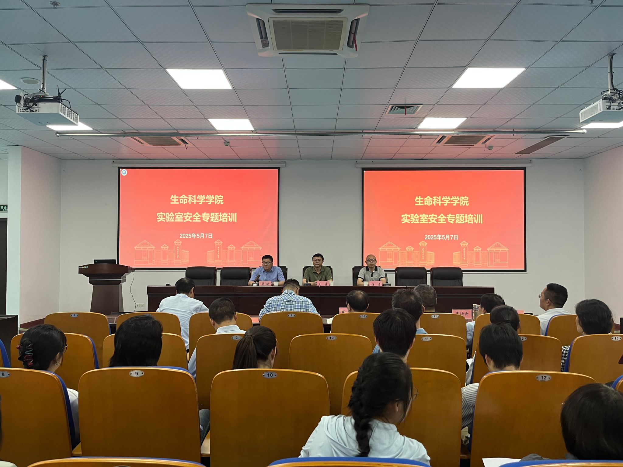 本网讯 为全面筑牢实验室安全防线,确保教学科研实验活动规范有序、安全高效运行,切实守护广大师生生命健康安全,强化师生实验室安全责任意识与风险防范能力,5月7日下午,生命科学学院在生物科技楼B438会议室召开实验室安全工作专题培训会暨教职工大会。校实验室安全管理中心主任王涛、副主任郭晓东出席会议,生命科学学院党政领导、全体教职工、研究生党员等参加培训。会议由院长薛挺主持。