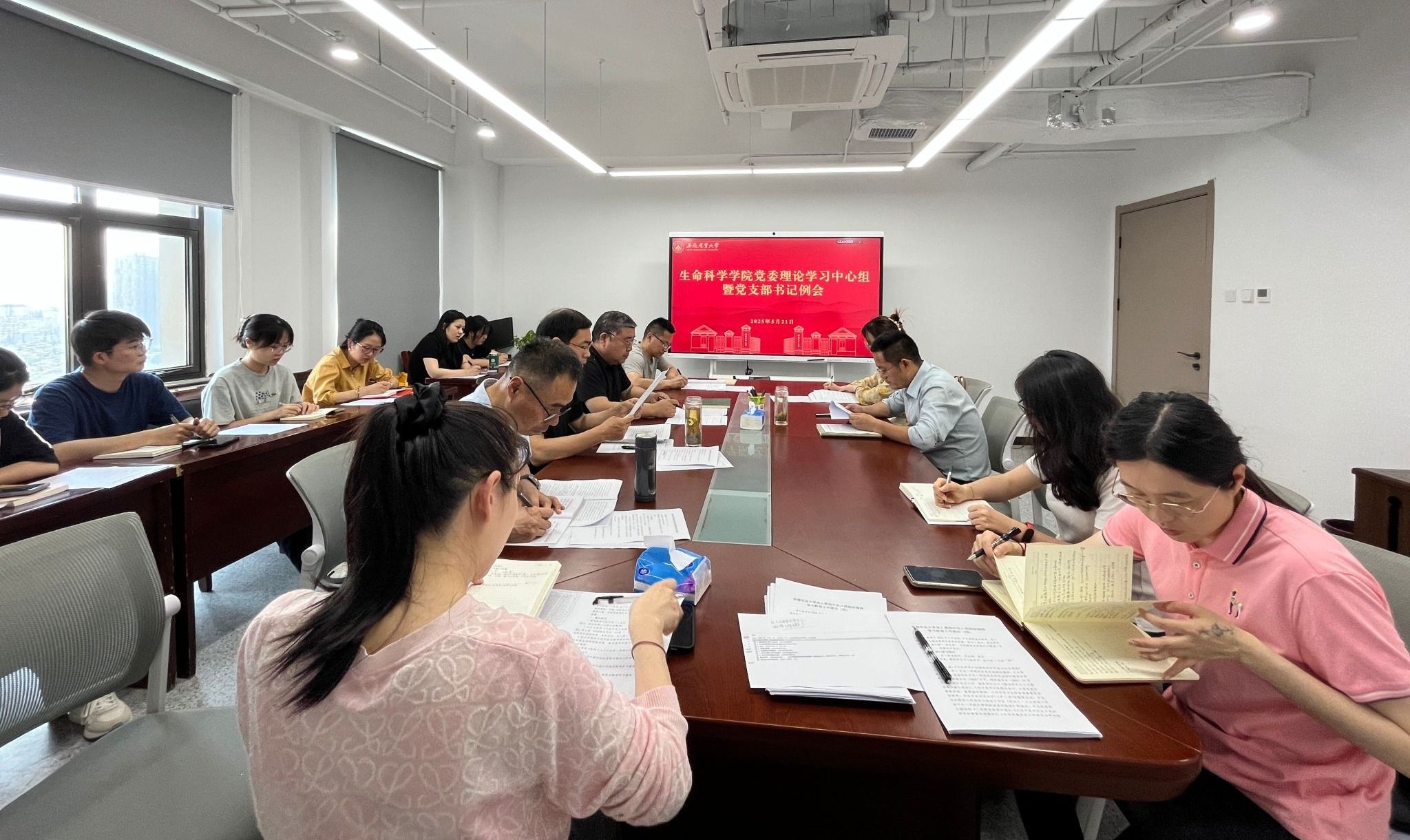 本网讯 5月21日,学院召开党委理论学习中心组扩大会暨党支部书记例会,及时传达学习贯彻校第八次党代会精神,就深入贯彻中央八项规定精神学习教育工作进行交流研讨。院党委中心组全体成员、各党支部书记参加会议。