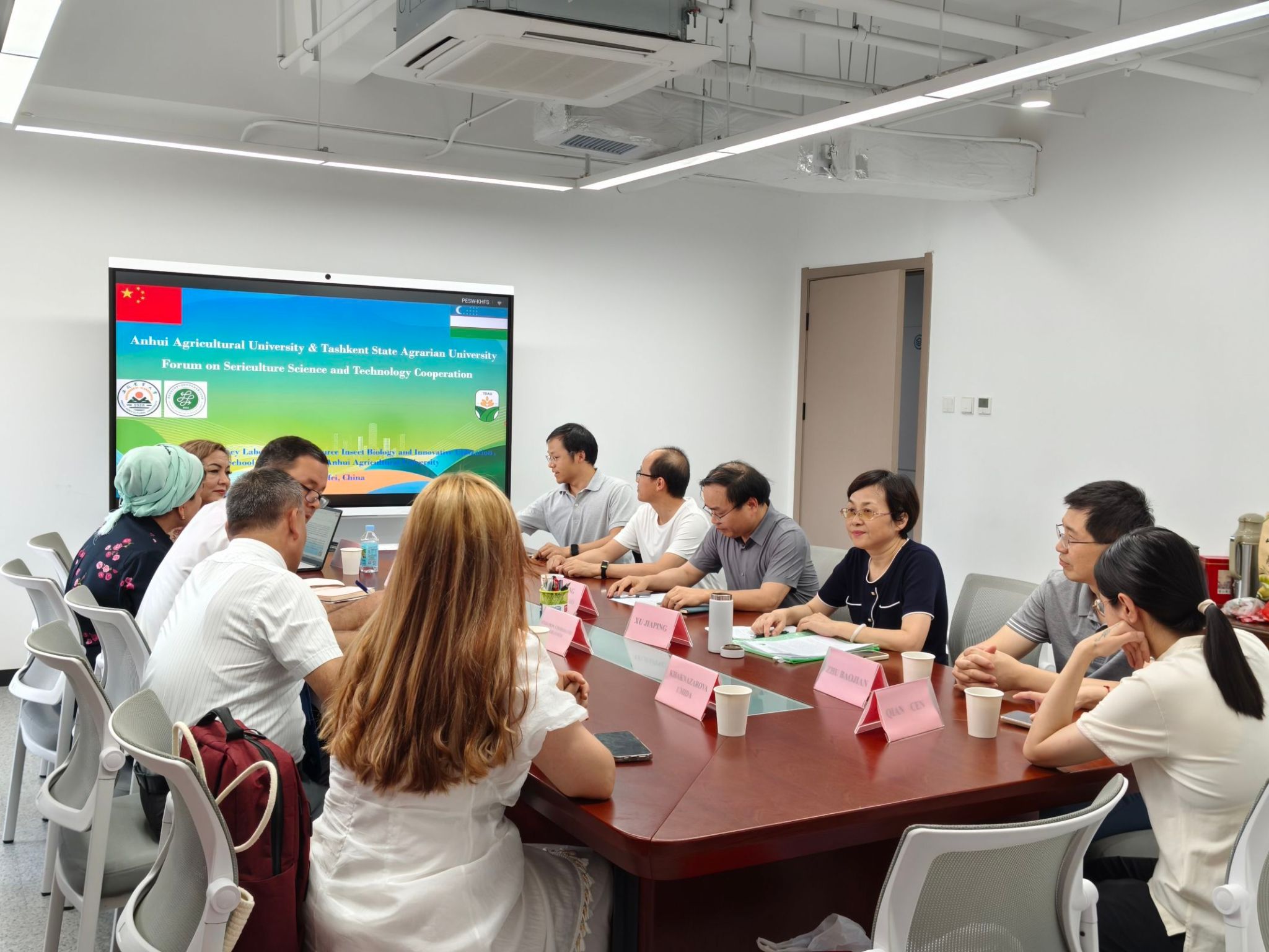 7月2日上午,交流活动在科技楼420启动。学院副院长张应烙出席活动并致辞,徐家萍教授和王磊副教授分别代表资源昆虫生物学与创新利用省重点实验室和蚕学与经济动物饲养系,向乌方代表团详细介绍了安徽省重点实验室及系部的学科渊源、学科建设、科研成果等情况。随后,乌方代表团介绍了乌兹别克斯坦养蚕业的发展概况,分享了当地蚕桑产业中的特色与经验。双方围绕养蚕业的产业需求、技术瓶颈以及未来合作方向展开了深入讨论,为后续合作奠定了坚实基础。蚕学经济动物系部分师生十余人出席会议。