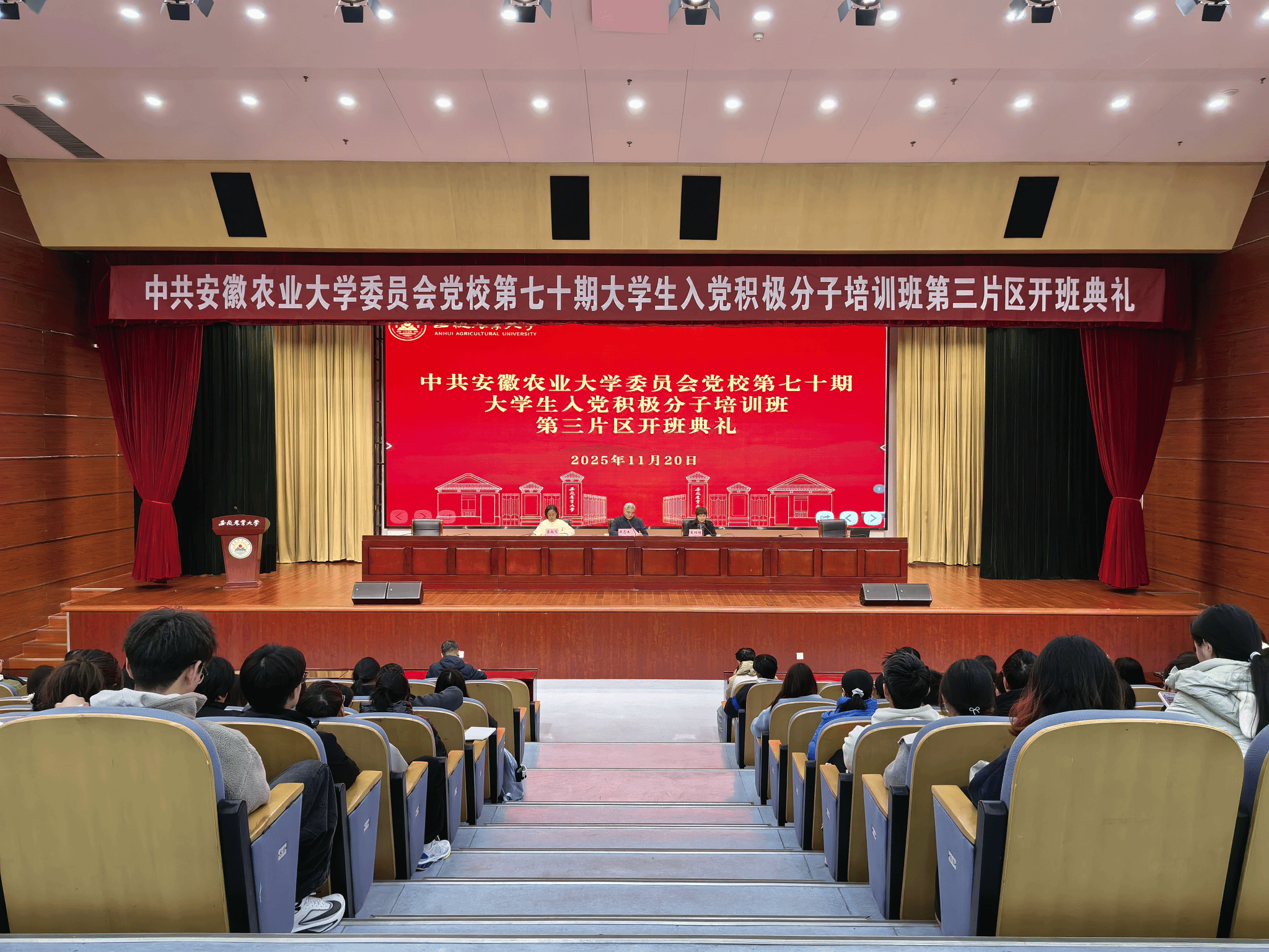 本网讯 11月20日晚上,中共安徽农业大学委员会党校第70期大学生入党积极分子培训班(第三片区)开班典礼在图书馆第一报告厅举行。农学院党委书记洪志生,生命科学学院党委副书记夏利明,信息与人工智能学院党委副书记、纪委书记李南飞出席会议。