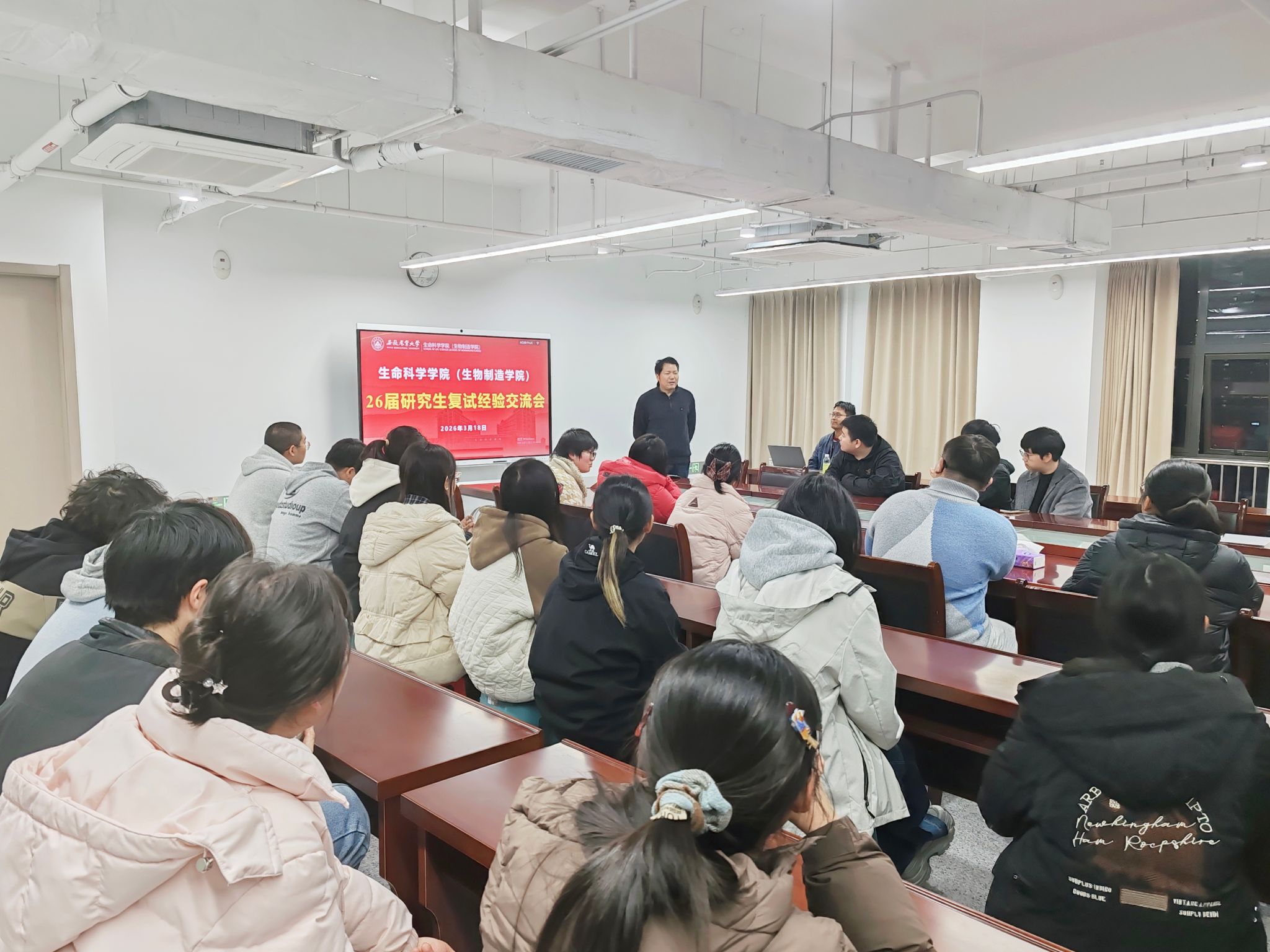 本网讯 3月18日晚,生命科学学院(生物制造学院)在勤业楼1907会议室举办了2026届研究生复试经验交流会,特邀四名优秀在读研究生校友及合肥新东方考研培训讲师进行考研复试经验分享。毕业班辅导员、学院2026年考研达线同学及部分23级学生代表参加会议。会议由学院副院长李庆主持。