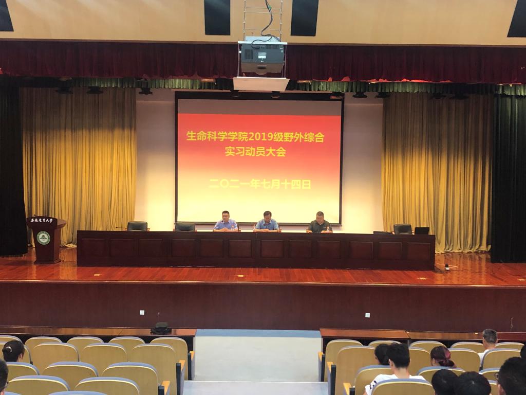 本网讯 7月14日下午,生命科学学院生物学野外综合实习动员大会在图书馆第一报告厅召开,学院院长江海洋,党委副书记、副院长闫大玮、副院长薛挺,实习指导老师,各班级辅导员以及我院2019级全体实习学生参加了动员大会。