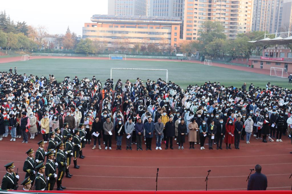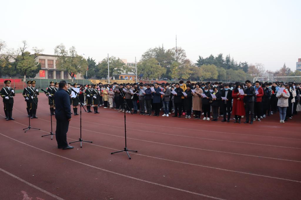本网讯11月29日早上7点,生命科学学院在校第一运动场举行“请党放心强国有我”主题升旗仪式暨宪法晨读活动。党委学生工作部、武装部、学生处(部)处长姚莉、党委武装部副部长兼学生处副处长刘柳、学生处副处长周涛,学院党政领导、教师代表、全体专兼职辅导员和在校学生参加了此次活动。仪式由学院党委副书记闫大玮主持。
