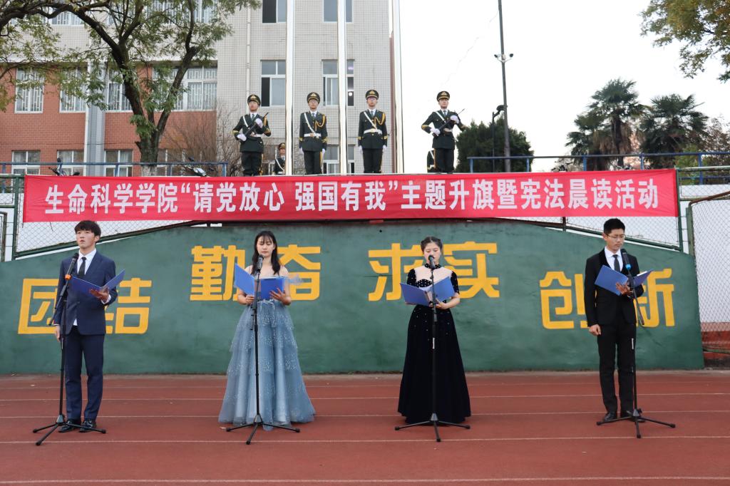 在鲜艳的国旗下,生命科学学院4名学生代表深情朗诵《请党放心 强国有我》,讲述100年来中国共产党带领中国人民开辟中国道路从站起来、富起来到强起来,实现中国奇迹的伟大成就。全场师生齐声高喊“请党放心 强国有我”铿锵誓言,引发共鸣!