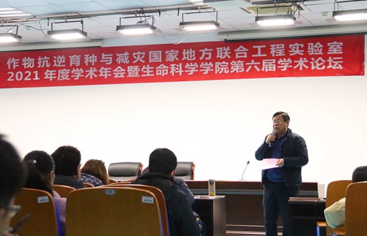 本网讯 1月13日,我校作物抗逆育种与减灾国家地方联合工程实验室2021年度学术年会暨生命科学学院第六届学术论坛在生物科技楼441报告厅成功召开。实验室主任程备久、研究生院院长蔡永萍、学院院长江海洋出席了学术年会,国家地方联合工程实验室、全院教职工及研究生共计100余人参加。江海洋致辞表示学术年会的成功召开是全院的一件大事,相互交流才能共同提高,共同促进生物学学科向高水平发展。学院共19位老师分别代表团队进行了总结汇报,并进行了充分的讨论与交流。