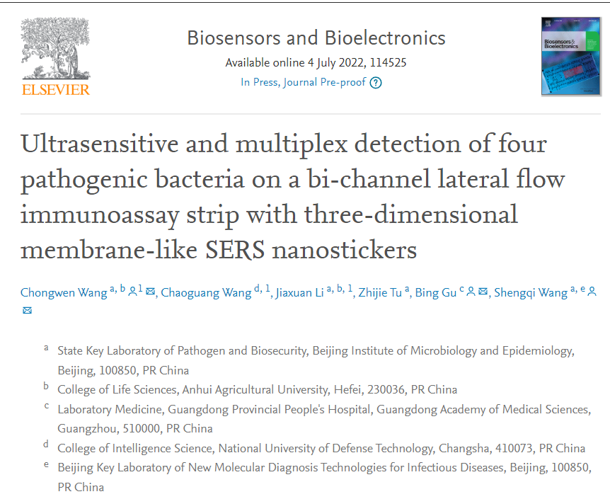 本网讯 真菌毒素和食源性细菌等危害物引发的食源性疾病每年导致全球5.5亿人感染和数十万人死亡,造成巨大的经济损失和社会负担。建立高灵敏的现场检测技术对于早期、即时有效地监管食品安全,保障消费者健康具有重大意义。近日,我校生命科学学院汪崇文副教授开发出基于膜状SERS标签的高灵敏免疫层析检测技术,可以快速、准确地鉴定复杂食物样本及环境样本中的多种真菌毒素和致病菌,检测毒素的灵敏度达1 pg/mL,检测细菌的灵敏度达10 cells/mL,检测时间小于20分钟。相关研究内容发表在领域内著名期刊《Chemical Engineering Journal》和《Biosensors and Bioelectronics》。汪崇文副教授为此项技术的第一及通讯作者,军事医学研究院王升启研究员和广东省人民医院顾兵教授为共同通讯作者。