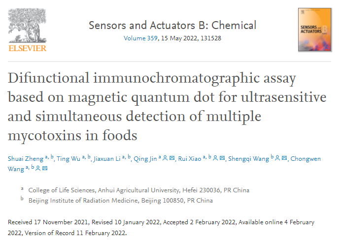 此外,汪崇文副教授近期还开发了一种基于磁性富集/荧光增强机制的真菌毒素免疫层析检测试剂盒,可以高灵敏同时检测粮食作物(如玉米、谷物等)中的三种常见真菌毒素(黄曲霉毒素B1、伏马毒素B1和赭曲霉毒素A)。该试剂操作简便,利用紫外手电或便携式荧光读取仪即可实现高灵敏分析,检测时间小于35分钟,灵敏度达1-20 pg/mL。相关论文发表在中科院一区杂志《Sensors and Actuators B: Chemical》上,郑帅博士为第一作者,汪崇文副教授、金青教授及军事医学研究院王升启研究员等为共同通讯作者,本校为第一单位。
