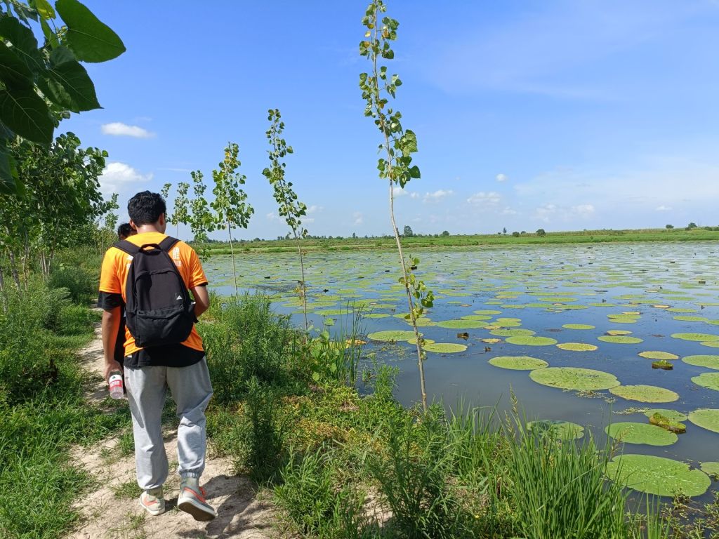魏陶介绍:“陶店回族村在2021年就已全面脱贫,在帮扶措施因人、因地施策,找准适合本村养殖的好路子”。团队成员跟随魏负责人到达村中特色种植塘,沿湖低洼地1200余亩,通过与农户签订合同,公开竞争的方式,进行轮流种植芡实、水稻。正值芡实收获时节,团队成员跟随魏负责人来到种植塘帮助村民捞取芡实,感受村民的不易和收获的喜悦。