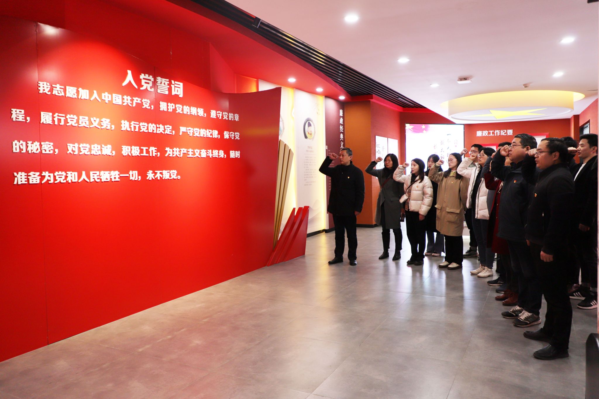 在讲解员的带领下,全体人员先后参观了廉政文化馆、法治文化教育馆和院史陈列馆,通过听取讲解、观看展板、展台、雕塑、廉政教育视频、亲身体验互动项目等方式,了解了我国各时期、各阶段的廉政制度和典型廉政人物及故事,深入学习了中国共产党反腐倡廉的历史进程和建设成果,深刻体会了党中央坚定不移落实全面从严治党的信心和决心,让大家在正面典型与反面案例的鲜明对比中认识到腐败的巨大危害,真切意识到“坚决打赢反腐败斗争攻坚战持久战”的重要意义。参观过程中,在院党委书记甘传鹤的带领下,全体党员举起右手,重温了入党誓词,字字铿锵,坚定无悔。