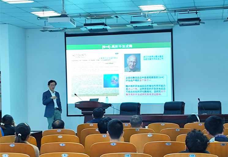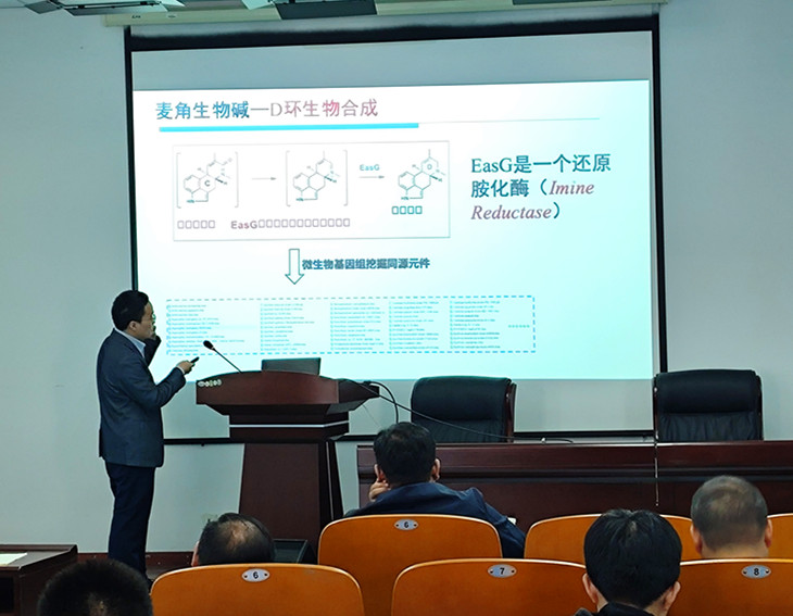 报告会上,戈惠明以“复杂天然产物的生物合成研究”为题、高书山以“真菌天然产物的合成生物学研究”为题、分别作了精彩的学术报告。两位主讲嘉宾的报告内容丰富,开阔了广大师生的科研视野;参会师生纷纷表示,此次报告对天然产物相关领域的科研工作具有深刻的启发性。