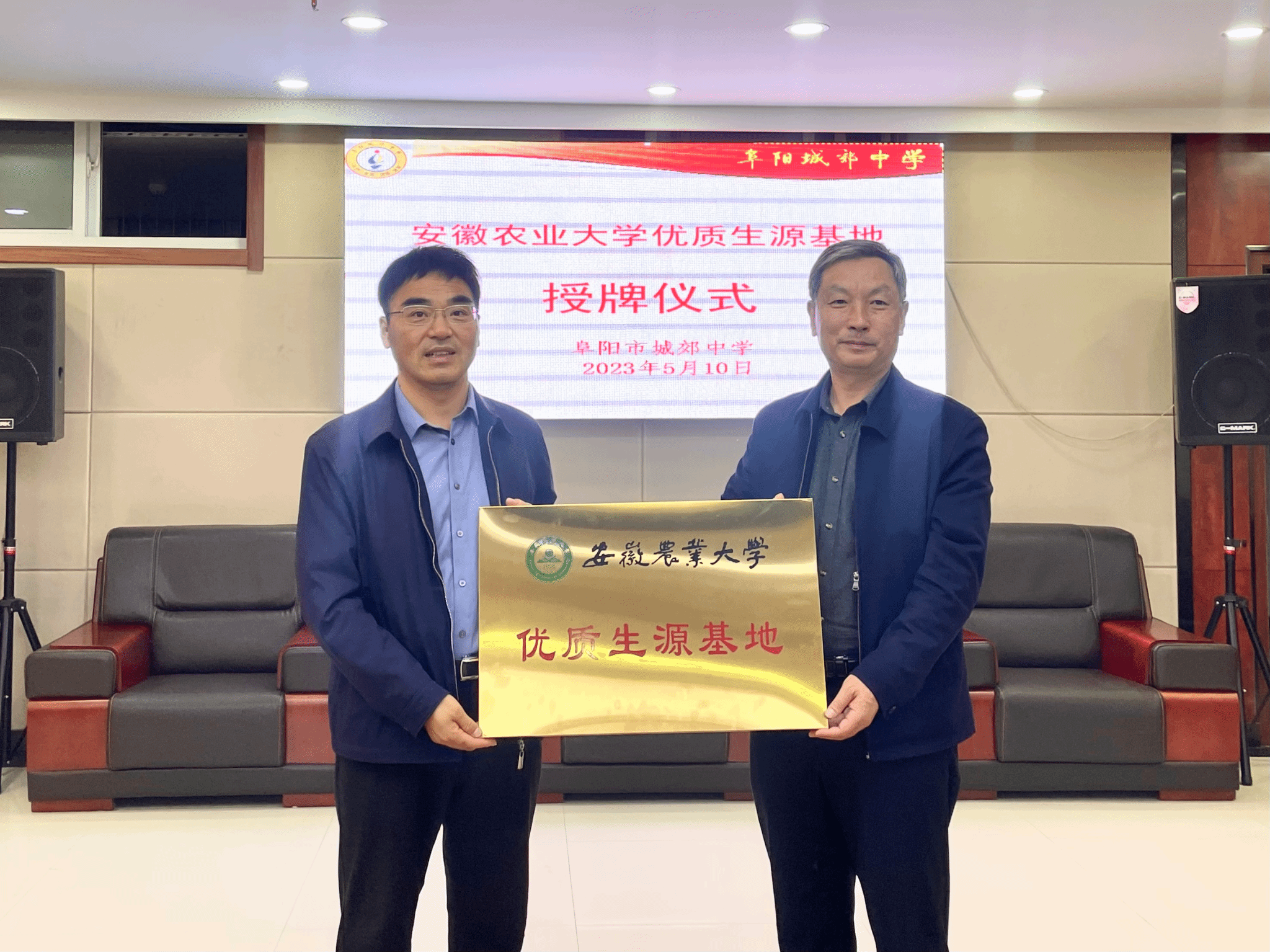 在座谈会上,倪士昌对生命科学学院一行表示热烈欢迎,就阜阳市城郊中学的现有规模、办学理念、生源情况、育人成果等作了详细介绍,表示希望进一步与我校开展交流合作。甘传鹤介绍了安徽农业大学的基本情况以及近年来在教育教学、科学研究、学生培养等方面取得的成绩,闫大玮回顾了近年来从阜阳市城郊中学考取安农大的学生在校发展情况,希望阜阳市城郊中学及毕业生班主任多宣传、关注安农大,学院将努力为学子成长成才做好服务工作。双方开展签约仪式,甘传鹤代表学院向阜阳市城郊中学授予“优秀生源基地”铜牌。