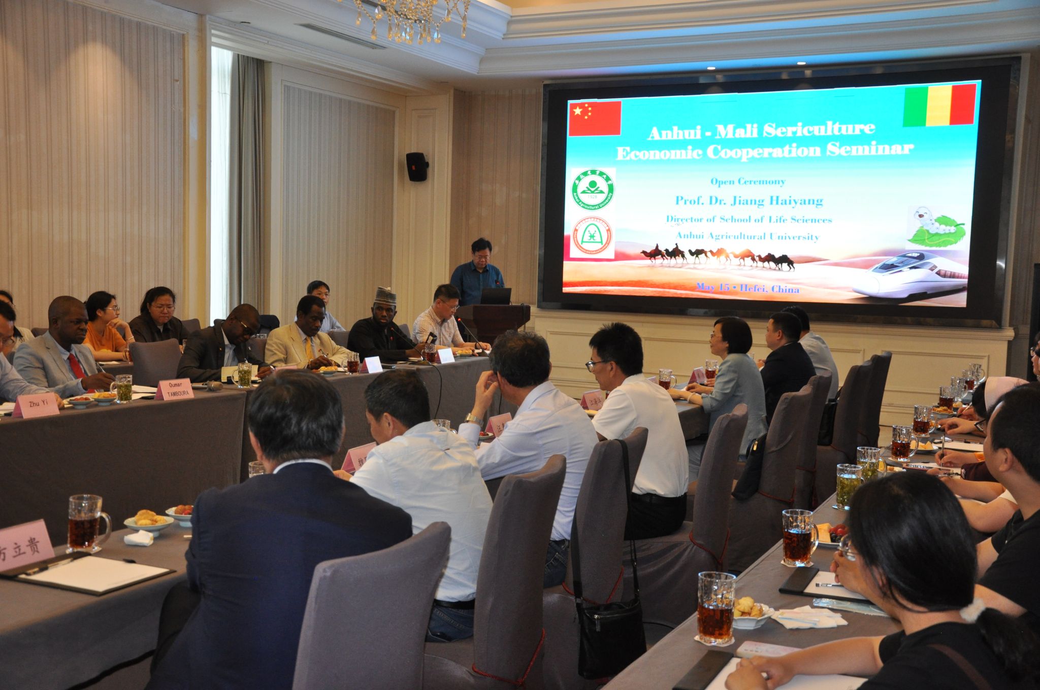 本网讯:5月13-15日,我校生命科学学院成功举办“安徽-马里蚕业经济合作论坛”国际学术会议。5月15日下午学术会议在安徽饭店举行,安徽农业大学生命科学学院院长江海洋出席会议并致欢迎辞。马里国家乡村发展部技术顾问(副部级)Mouhanmed B.DIARRA先生、马里国家乡村发展部国家农业局局长(副部级)Oumar TAMBOURA先生、浙江师范大学非洲研究院马里籍高级研究员、非洲博物馆馆长Yoro DIALLO先生以及非洲龙润集团董事长朱艺先生等出席会议。安徽农业大学生命科学学院研究员徐家萍、安徽省农科院蚕桑所副所长汪泰初、安徽京九丝绸股份公司总经理周炎以及安徽非洲文化经济交流协会部分成员、安徽农业大学生命科学学院蚕学与经济动物系部分教师、安徽省农科院蚕桑研究所部分科研人员共40余人出席会议。