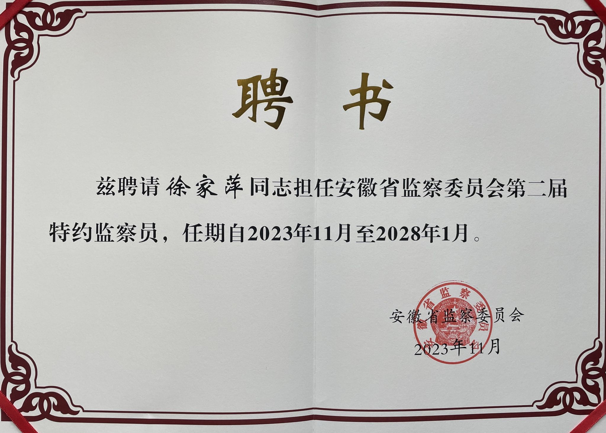 本网讯 近期,省监委发布《安徽省监察委员会关于聘请第二届特约监察员的决定》。11月16日,省监委召开第二届特约监察员聘请会议,优选聘请24名特约监察员。省委常委、省纪委书记、省监委主任刘海泉为特约监察员颁发聘书并讲话。我院徐家萍研究员获聘。