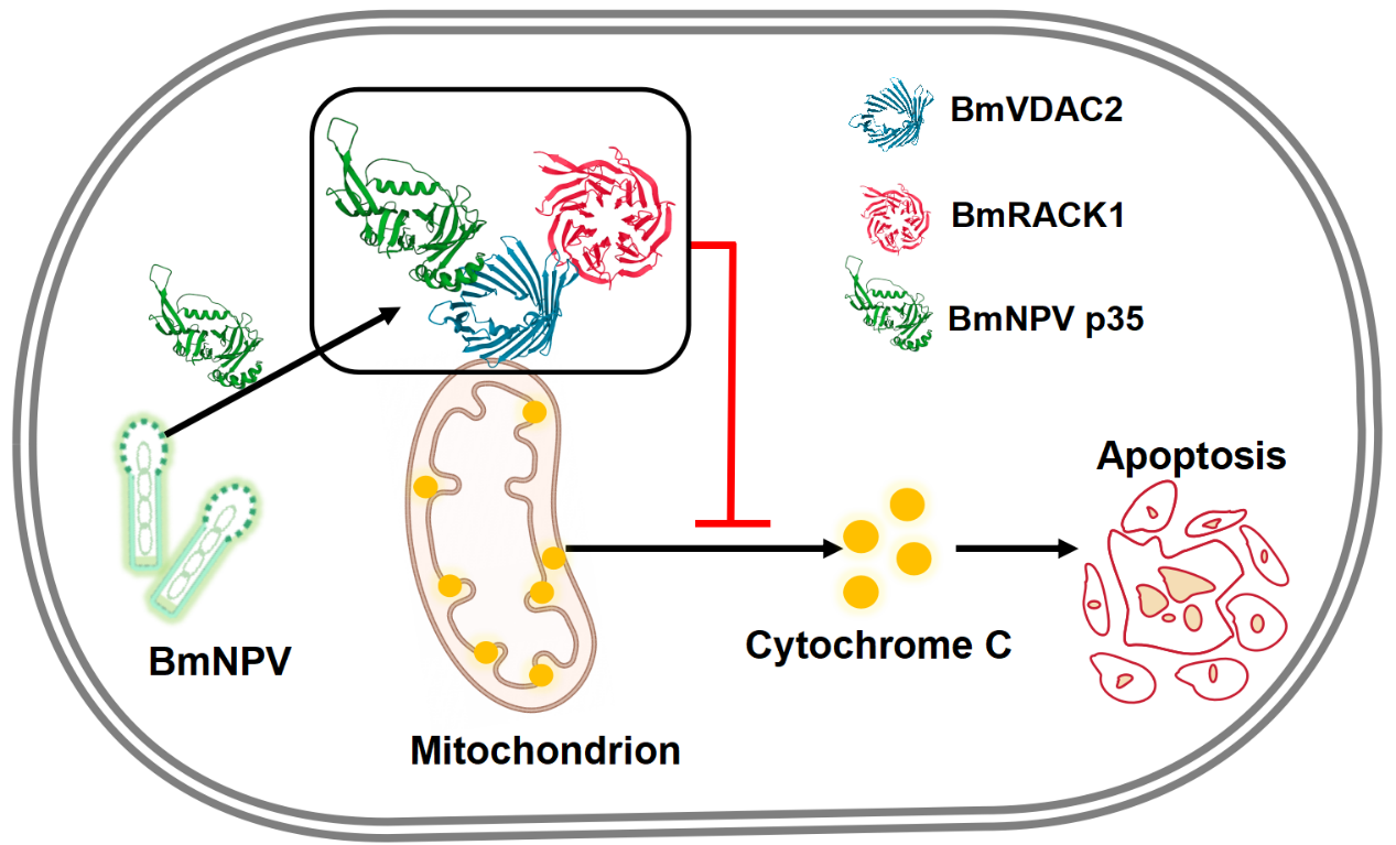该研究明确了BmRACK1和BmVDAC2存在互作,探讨了BmNPV抑凋亡蛋白p35和VDAC2-RACK1复合物之间的相互作用模式,揭示了p35-VDAC2-RACK1三元复合物通过抑制cyto c释放来调节细胞凋亡的分子机制,研究结果对于深化杆状病毒与宿主互作的认识具有重要价值。