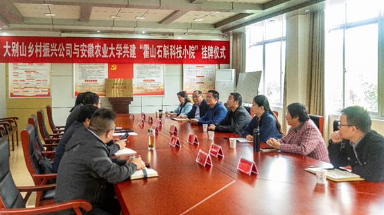 本网讯 4月11日,安徽霍山石斛科技小院在霍山县大别山乡村振兴发展有限公司挂牌成立。校党委研究生工作部副部长(主持工作)姜家生、六安市发改委副主任杨智良、霍山县发改委副主任储健、大别山乡村振兴发展有限公司总经理姚永柱、生命科学学院副院长顾龙江、科技小院首席专家、指导老师参加了揭牌仪式。