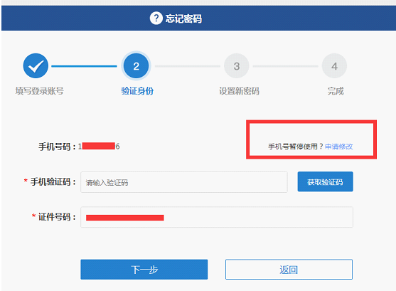 查看左侧手机号是否正确,如正确直接获取验证码修改登录密码,如不正确点击手机号暂停使用?申请修改。