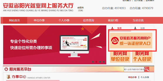 答:打开阳光就业网上服务大厅:ygjy.ah.gov.cn 通过点击“安徽政务服务网用户统一认证登录入口”