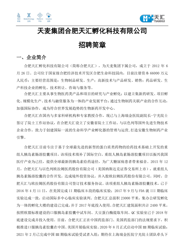 合肥天汇孵化科技有限公司招聘简章