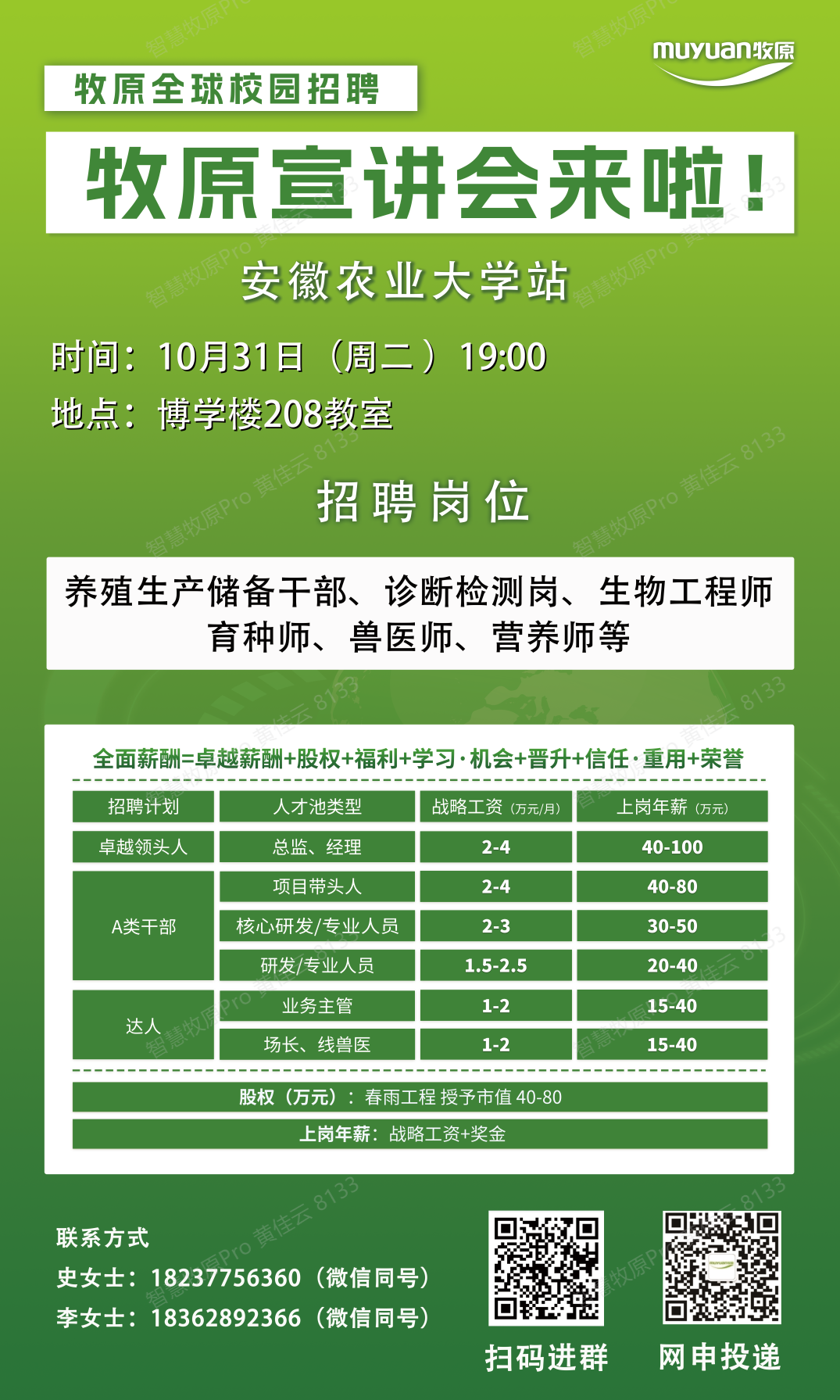 时间:10月31日(周二)晚上19:00地点:博学楼208关于牧原 万亿级实体行业新赛道,饲料、种猪、养猪、屠宰、食品、生物制品等全产业链发展 业务遍布全国25省,员工14万+ 市值2000亿+,2022年营收1248亿【热招岗位】养殖生产储备干部、诊断检测、生物工程师、育种师、兽医师、营养师等【招聘薪酬】年薪15-40w现场专业hr一对一岗位推介,更有精品猪肉礼盒等你来拿~进群咨询:——>点击即可跳转至链接<——戳我网申:——>点击即可跳转至链接<——请有就业意向的学生于明天指定时间前往博学楼208参加专场宣讲会,谢谢!